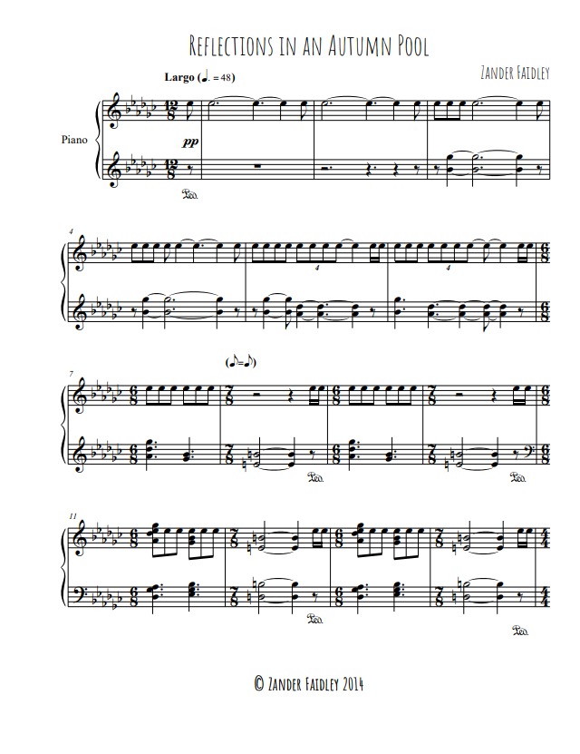 Reflections in an Autumn Pool is a simple tone poem. The point of the piece is to transport the listener to a place solely through the use of musical ideas. The destination, in this case, is found within the title itself; however, the intended images will not be specified here.